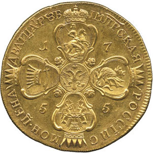 Существовал проект золотой монеты 20-рублевого номинала, однако высочайшего утверждения он не получил. Интересно отметить, что эта пробная монета, отчеканенная в 1755 году, на сегодня является одной из самых дорогих в истории российской нумизматики: на лондонском аукционе 2008 года она была продана за 1 млн 550 тысяч фунтов (1.782.500 фунтов с учетом комиссионных, или около $2,9 млн). На аверсе монеты портрет императрицы Елизаветы Петровны работы Скотта. На реверсе пять картушей с гербами, которые расположены крестообразно: московский, казанский, сибирский, астраханский, с российским в центре. Цифры года выпуска находятся в углах креста.